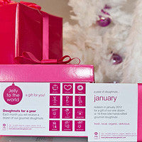 Give the gift of a year of doughnuts, with whimsical cards for every occasion, packaged in a presentation box. Each month one dozen or 16 of the three-bite size doughnuts can be picked up.
