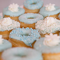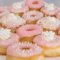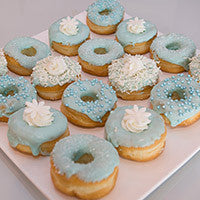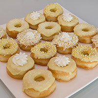 16 of our wedding-themed three bite doughnuts beautifully presented on a tray.